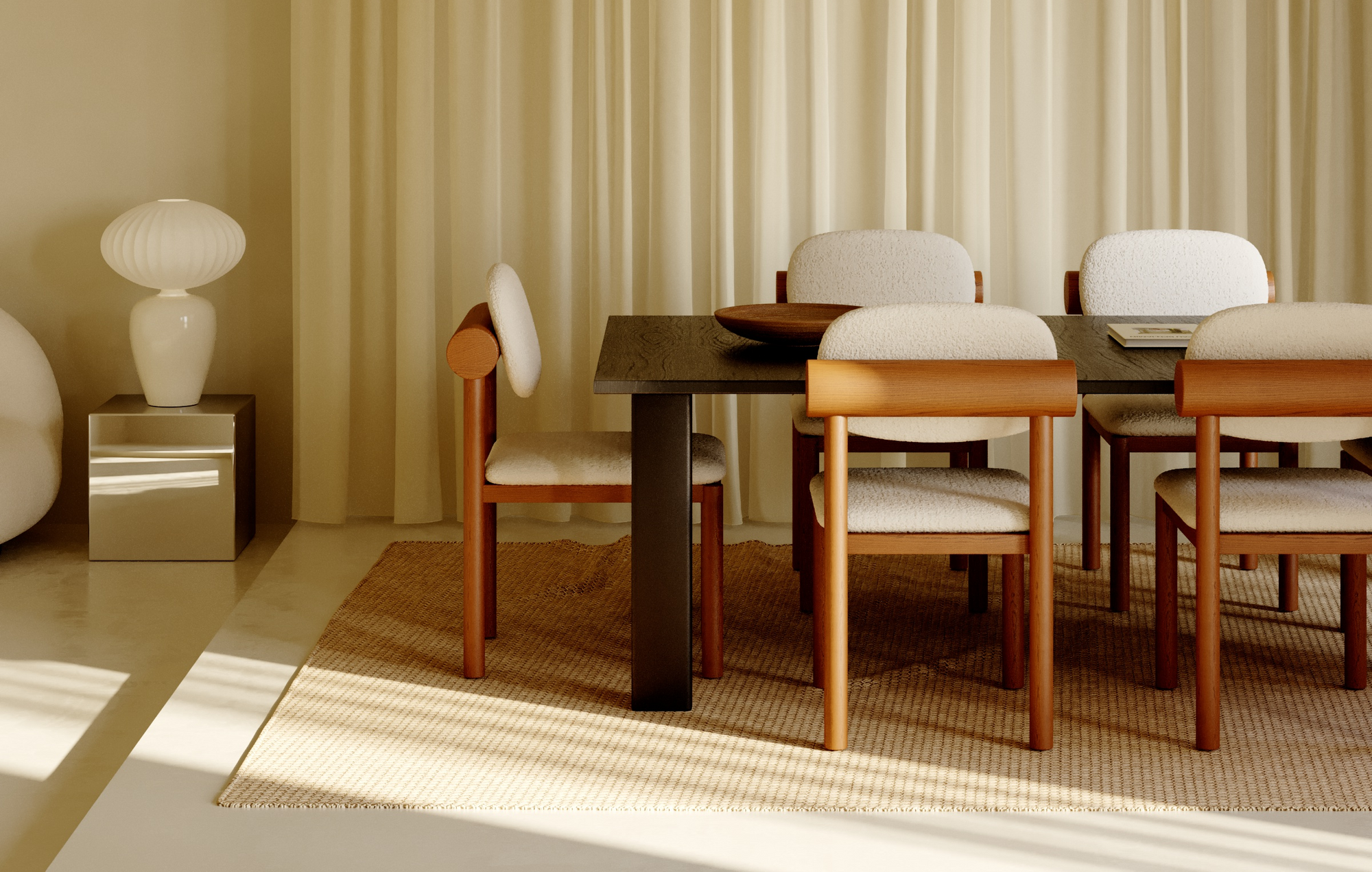 The Mikado is a chair inspired by Japanese art evoking escape and mastery of wood. Designed to be comforting, the chair is crafted from cherry-hued solid ash and trimmed in a bouclé wool fabric. It is entirely developed and made in Italy.